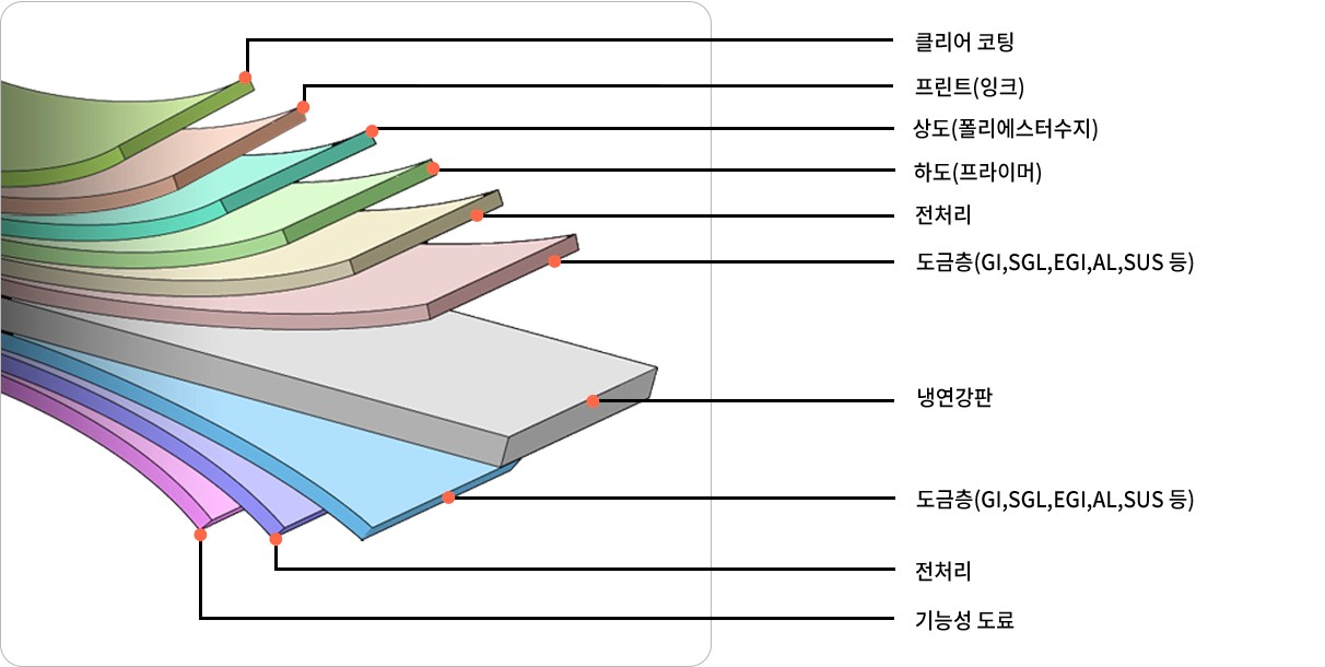 고내식 도금강판 위에 인쇄층과 보호필름을 적용해 색상과 질감이 오래 유지됩니다.